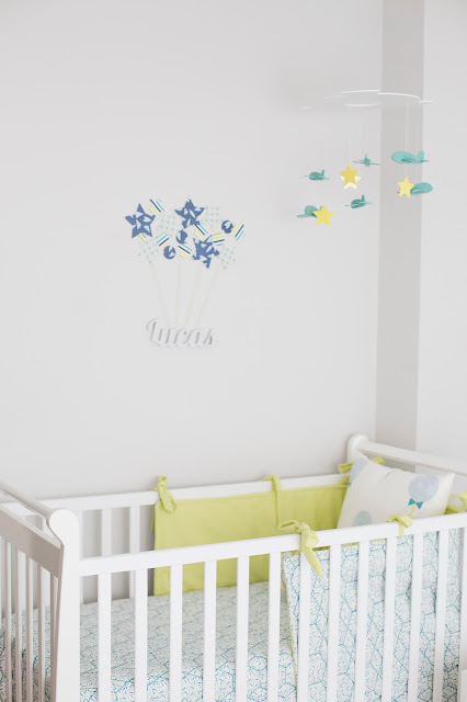 Concerning the colors chosen, D. didn't wanted to choose the traditional baby blue and loved the balloons' fabric collection, which has various shades of blue, lime and water green. Untraditional colors in a nursery, but that result beautifully and very harmonious. Also, allow parents to give a sister to little because as it works for both genders. I was very happy with the result. Do you like it? If you have question, please let me know!