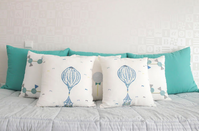 Quanto às cores escolhidas, a D. queria fugir ao tradicional azul bebé e adorou a colecção dos tecidos dos balões, que tem vários tons de azul, um lima e verde água. Cores pouco tradicionais num quarto de bebé, mas que resultam lindamente e muito harmoniosas. Além disso, permitem que os pais dêem uma irmã ao pequenino, pois resulta para ambos os sexos. Fiquei muito feliz com o resultado. Vocês gostam?