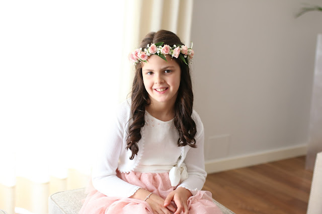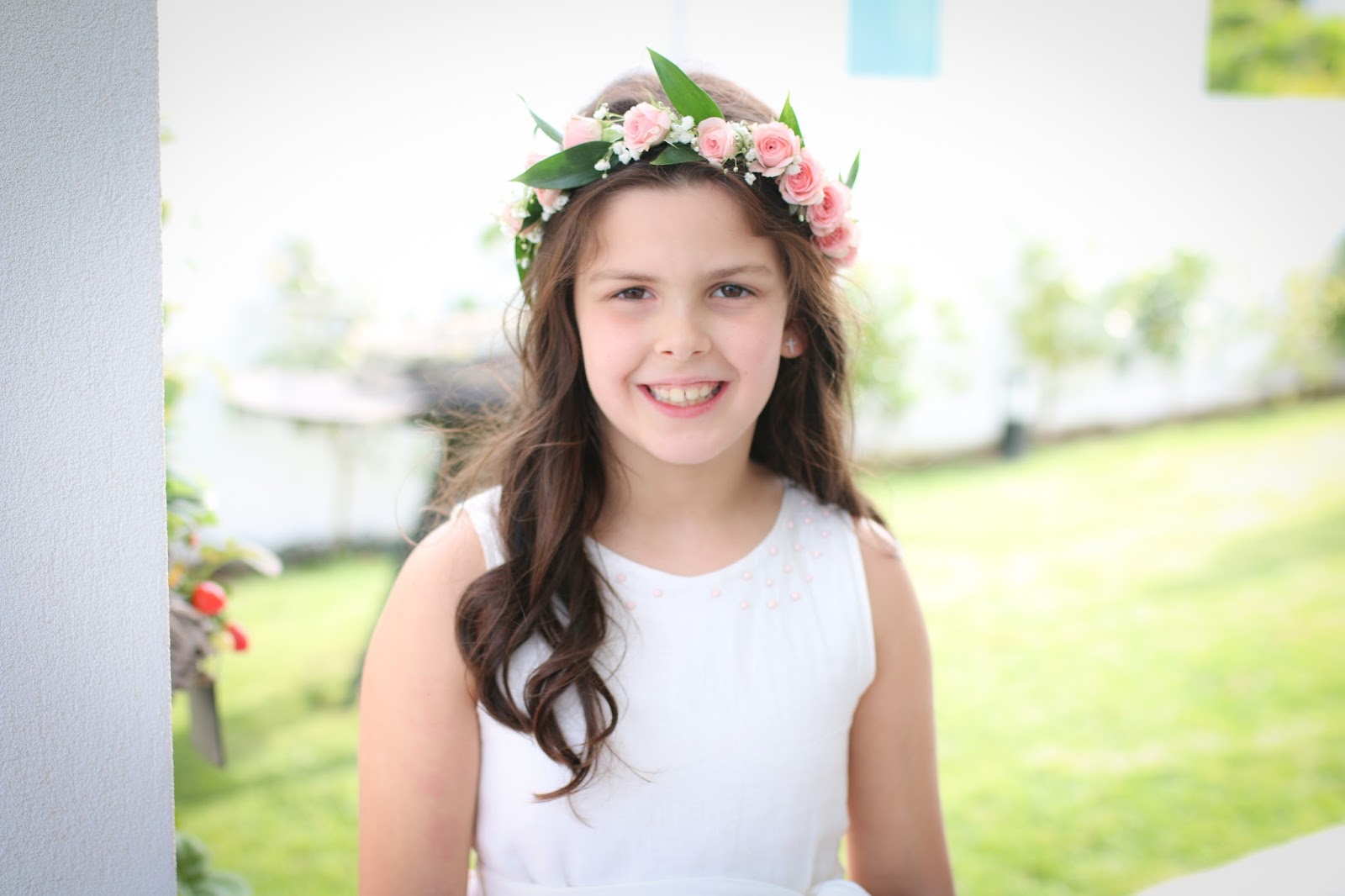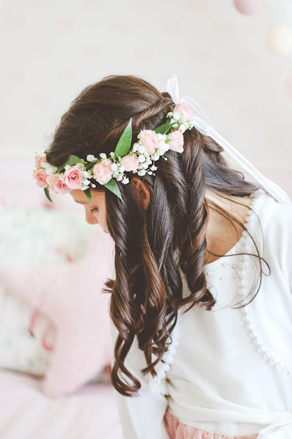 O pormenor que faltava era a coroa de flores. Adoro coroas de flores naturais. A Leonor e a Matilde já levaram coroas em vivaz ao casamento da minha irmã (há 9 anos), a Leonor já levou uma coroa com rosas de santa Teresinha em botões na sua primeira comunhão, apenas para a Matilde optei por um penteado preso, pois achei que ficaria melhor com o vestido que ela levou. Desta vez, voltei a querer a coroa de flores, mas queria que fosse diferente das que já fizemos antes, queria uma coroa em que as flores fossem mais expressivas. Por isso, falei com o Sr. Joaquim, de flores de Joaquim Santos sobre o que gostava, levei foto do vestido e fotos de coroas que me serviram de inspiração e este foi o resultado. A coroa ficou linda e exatamente como eu queria, com os botões abertos e num estilo mais hippie chic, pois o vestido da primeira comunhão assim pedia.