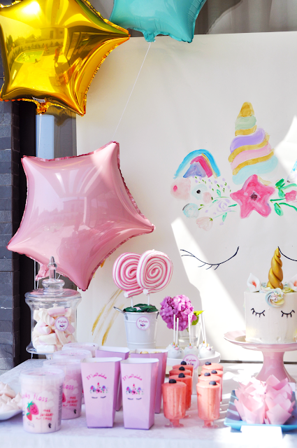 Como o tema Unicórnio está muito na berra não é difícil encontrar elementos à venda para decorar a mesa, por isso, encontrei a pinhata na Hip Hip Hooray. Os balões e as palhinhas com unicórnios também são de lá, assim como os guardanapos de papel, que não aparecem nas fotos mas eram mesmo amorosos.