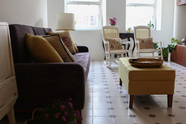 Neste apartamento a zona de estar é contígua à cozinha, numa lógica de open space. Por esse motivo, a consistência entre a decoração de ambos os espaços tem de ser ainda mais cuidada. O mesmo acabamento para algum mobiliário que, como já expliquei, pertencia à avó da minha querida R.